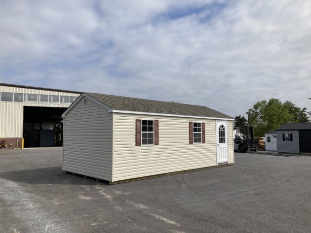 Color(s): Almond Siding, White Trim, Weather Wood roof, Red Shutters