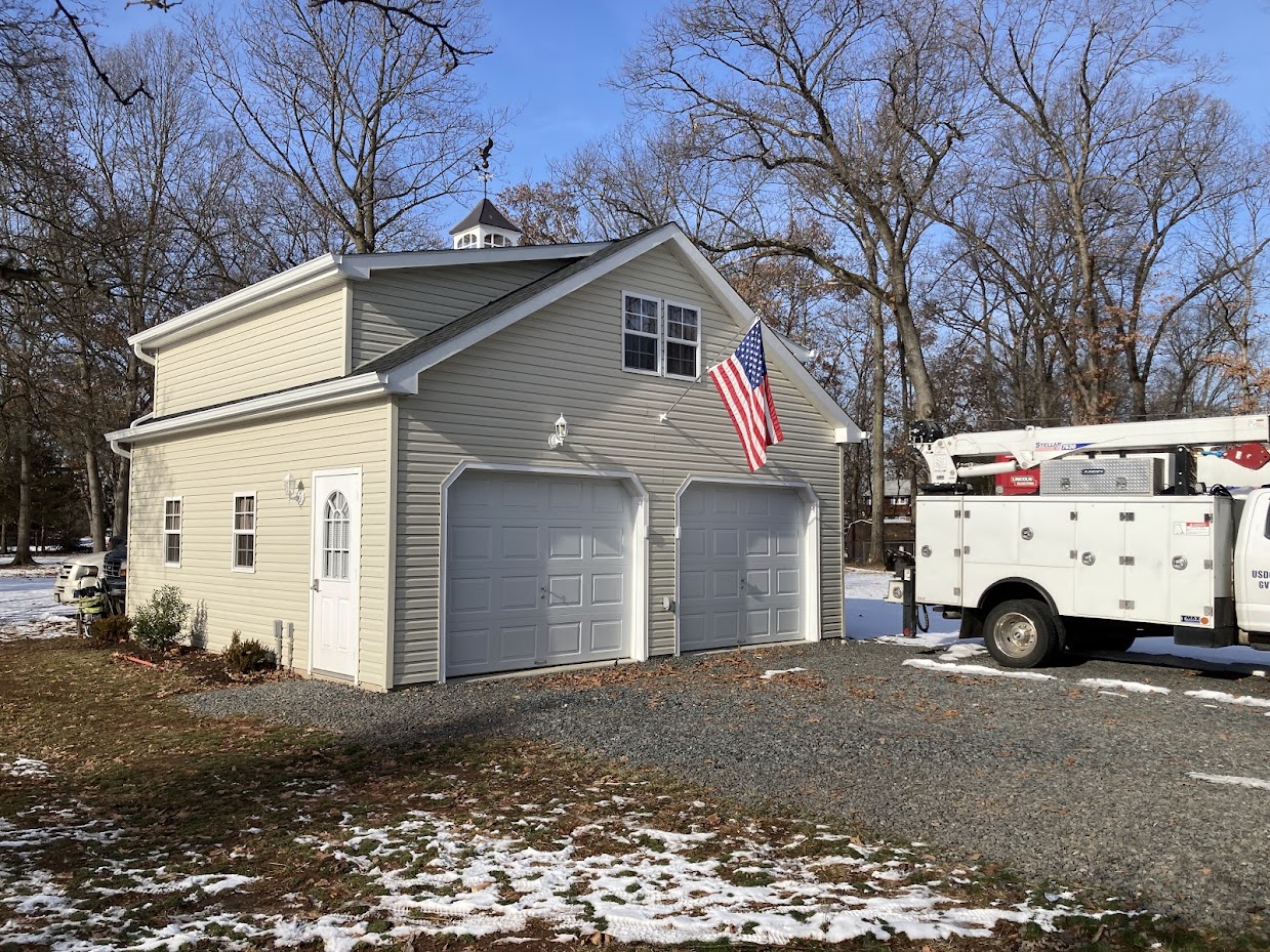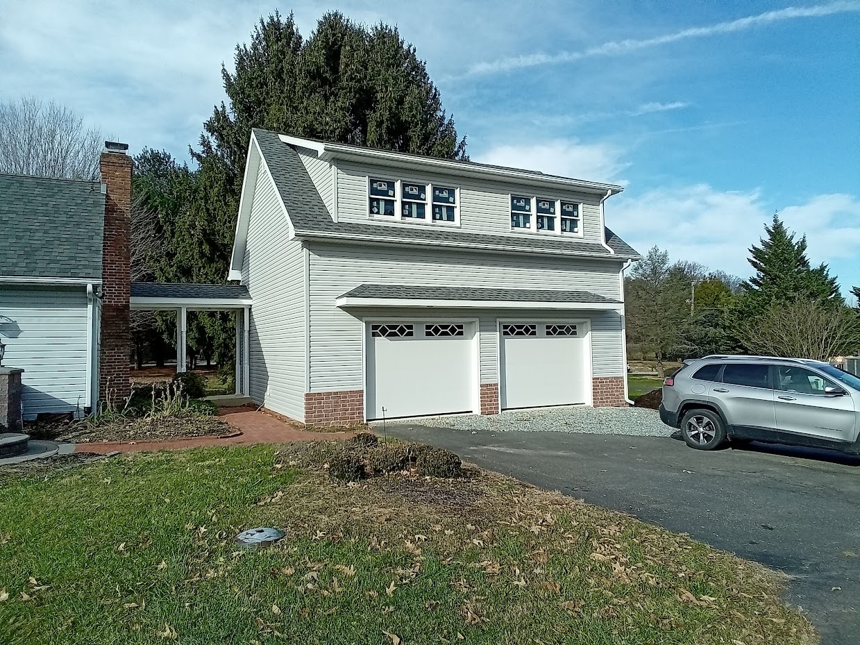 24×24 single-story garage in Lincoln University PA comes with 10′ walls, 7/12 roof pitch, 2′ front overhang, 9×8 doors, and a cathedral ceiling with plenty of room for the car lifts.