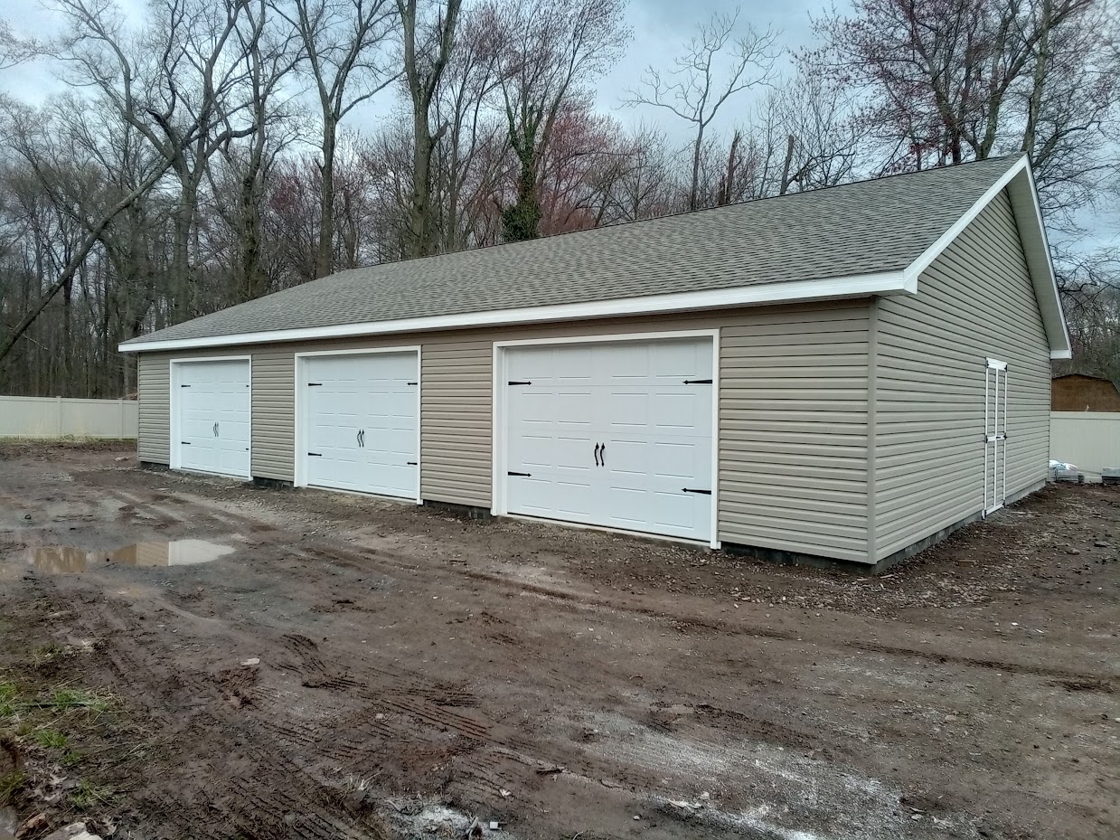 36×54 3 car garage with 8′ wall, 5/12 roof with scissor trusses, 12” vented overhangs, wooden double doors,
