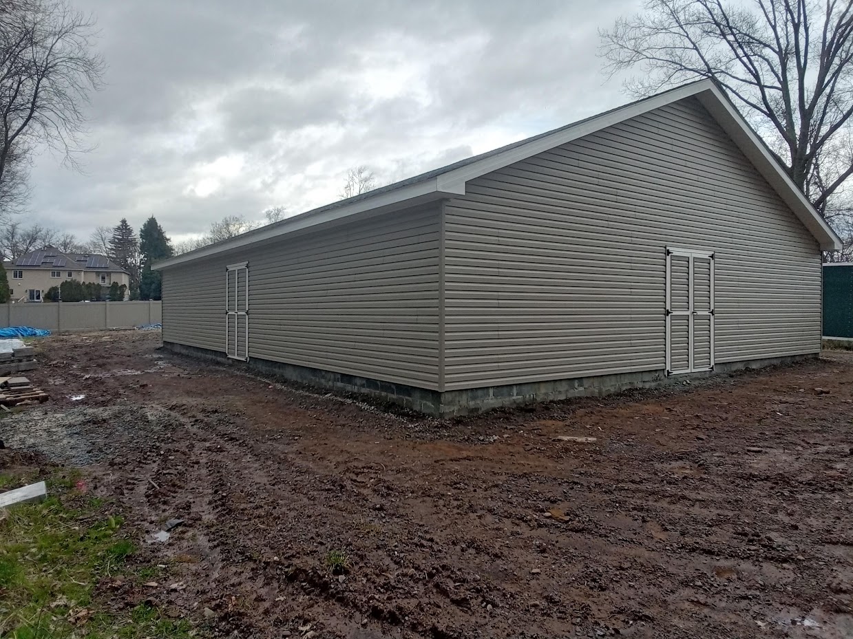 This building has a main 2-story garage section of 28×48 with a 12×48 porch on the back side, 20×40 RV garage along the side, 1 shed dormer, 1 transom dormer, vinyl siding, Architectural shingles, and 2 large garage doors.