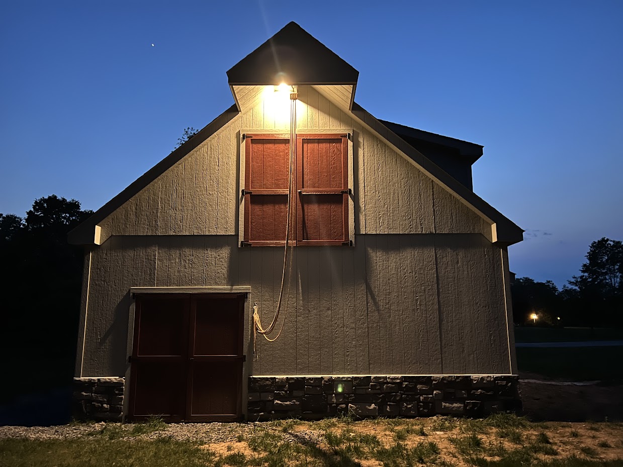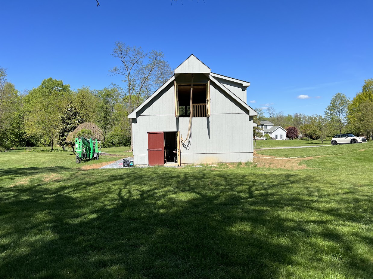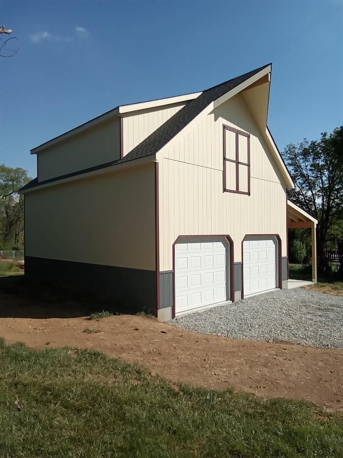 24×26 Barn Style Garage, with (2) shed dormers, 12′ ceiling height for car lift, 10×24 lean-to porch roof. LP Smart Siding, painted