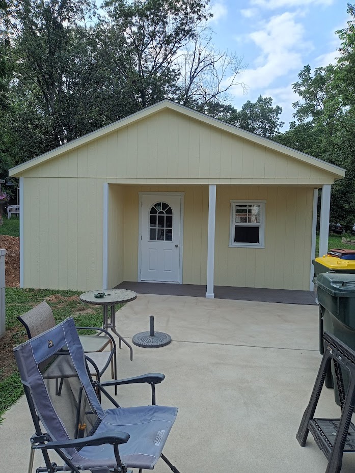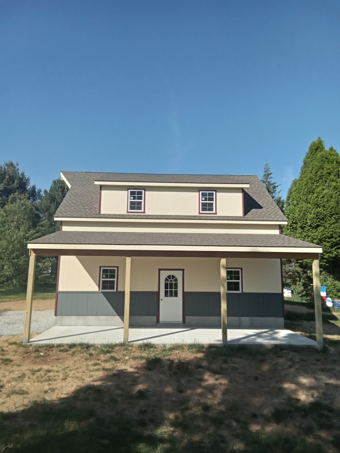 10×20 Cabin, featuring LP Painted smartsiding, 5×10 porch w/ loft, fully wired w/ breaker panel, 24×36 windows, 36” prehung entry doors