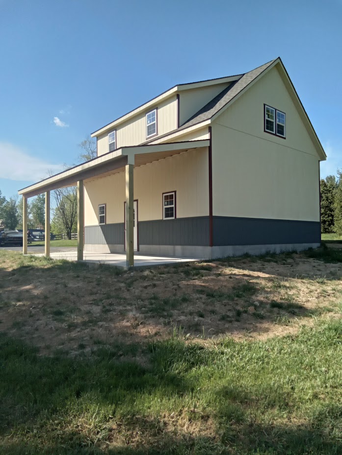 This beautiful building was designed to be a workshop on the 1st floor and a wreak room on the 2nd floor, it has 9′ ceilings on the 1st and 2nd floor, 12×30 covered porch, 14/12 roof pitch, Board and Batten siding and Charcoal shingles.