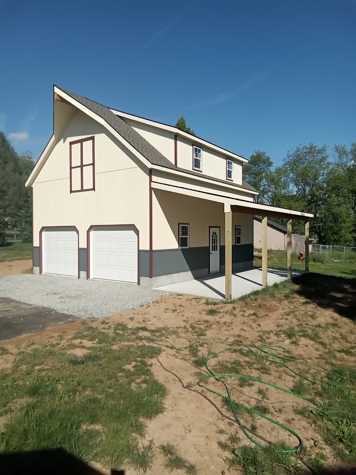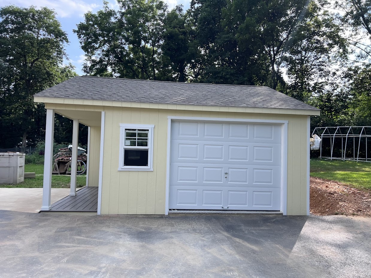 20×20 Garage with wooden floor, site preperation, 4×16 porch, 8′ walls, 5/12 roof, 16×7 garage door,