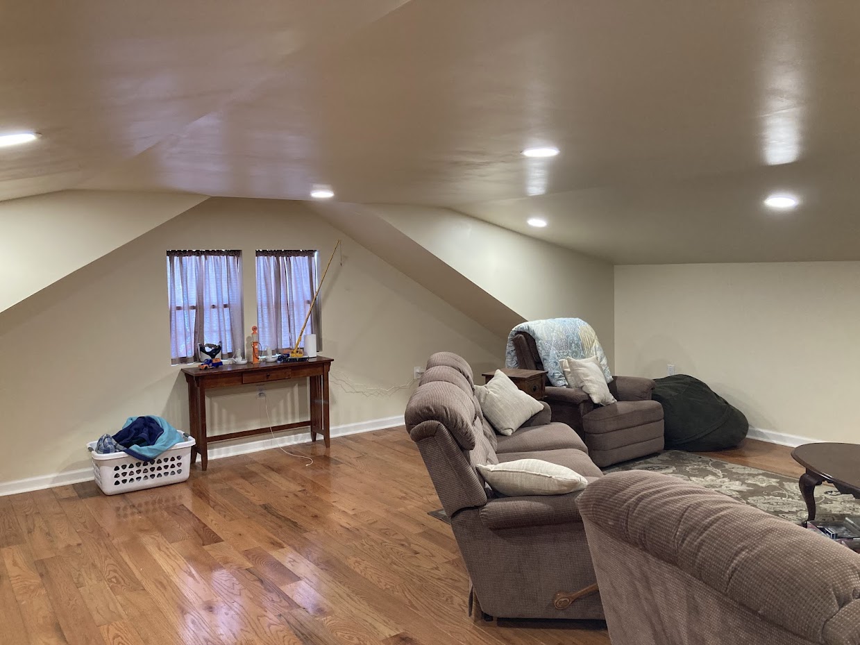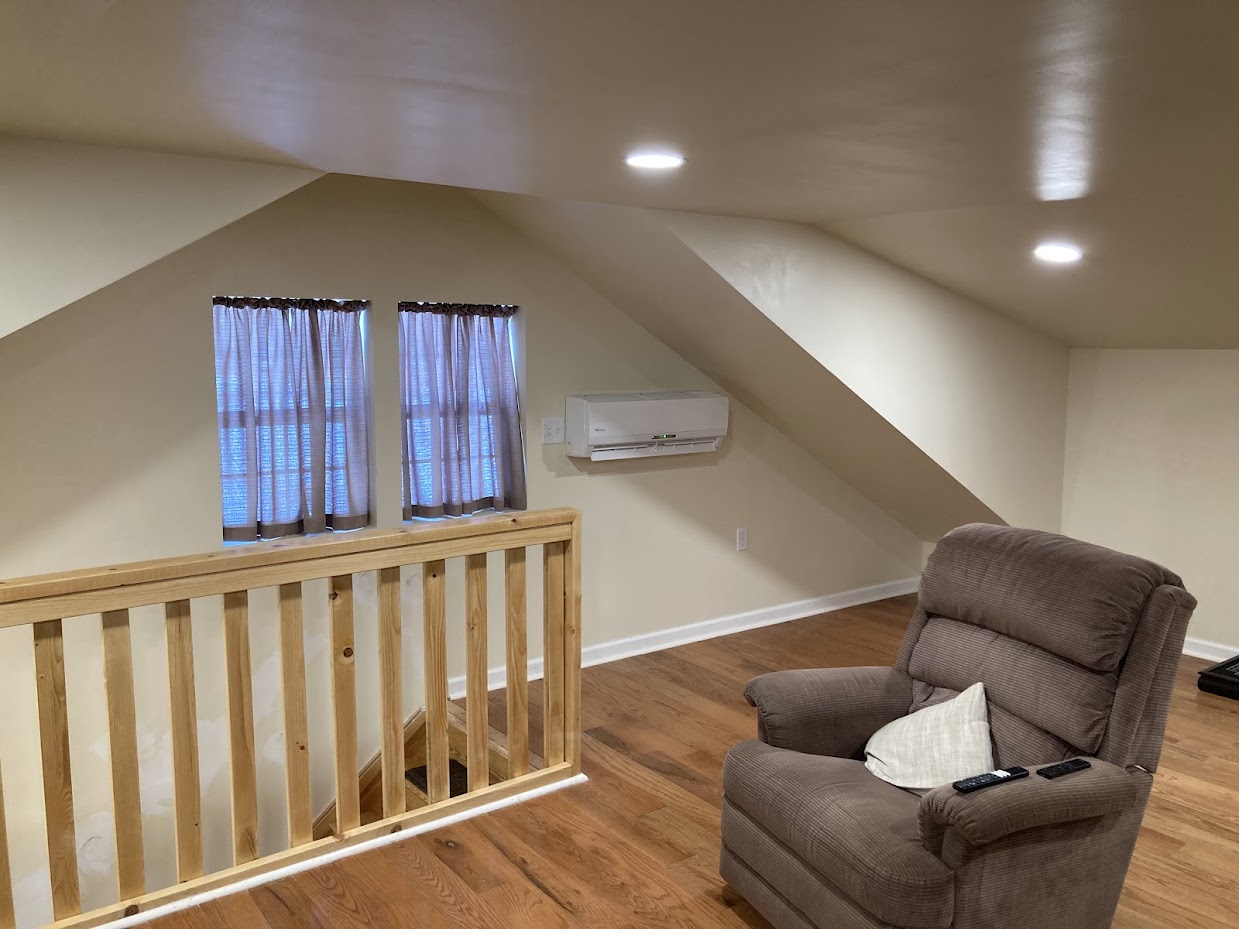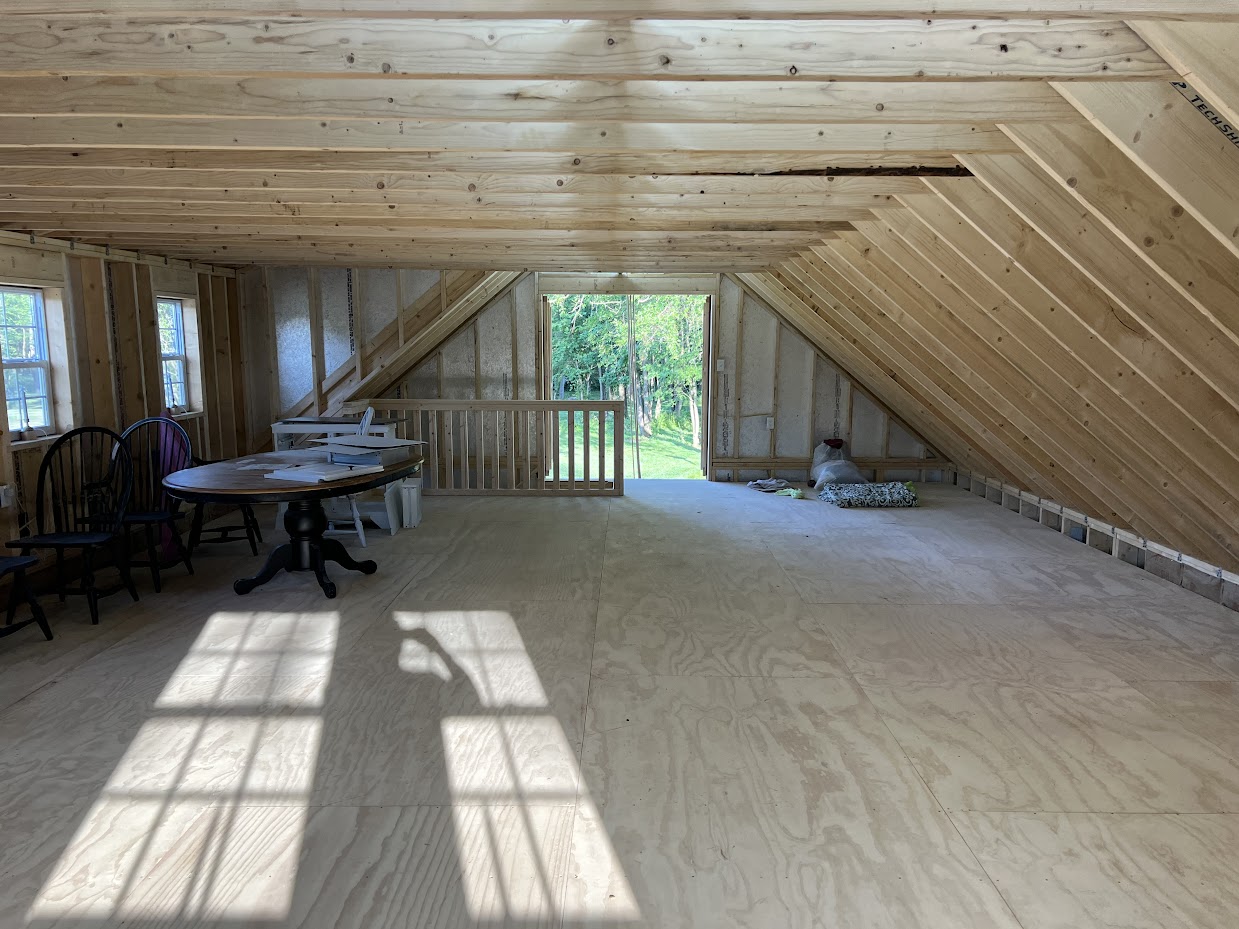 This building is more like a story and a half but still has a 7′ 9” ceiling on the first floor and a 7” ceiling in the attic, as well as a 36” full stairway to the second floor.