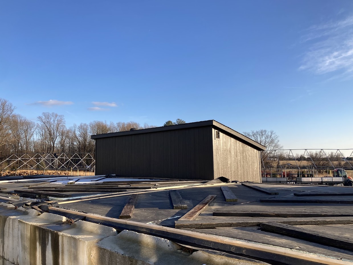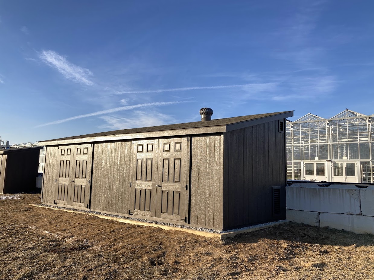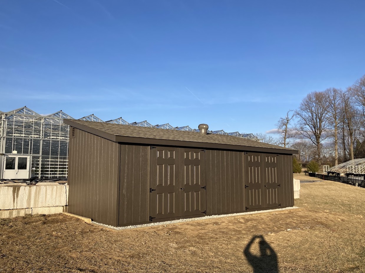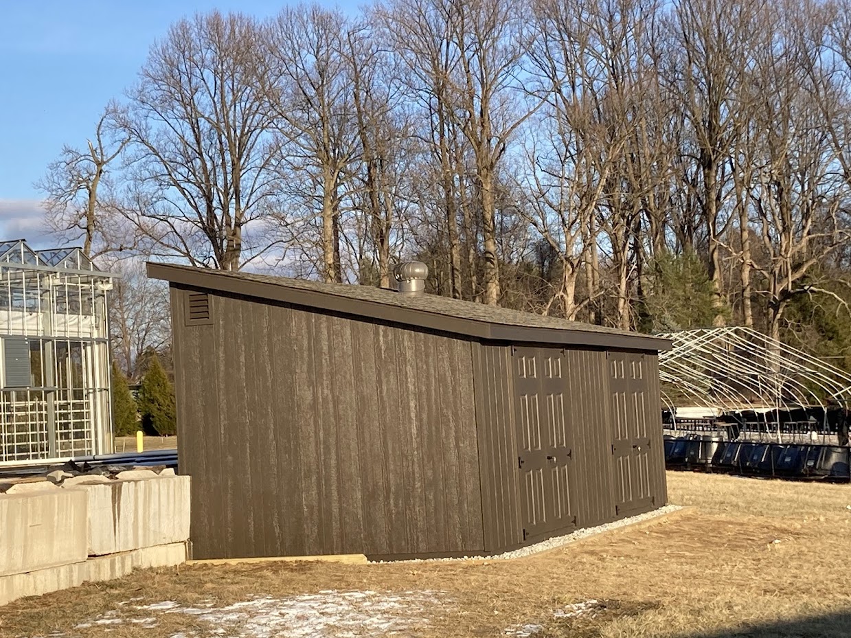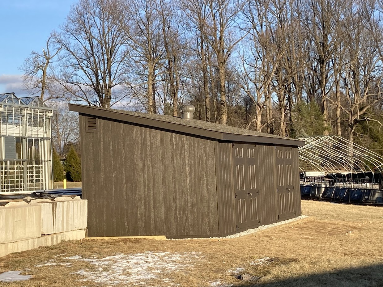 10×24 Lean-to water pump shed. This shed was custom-built to house Longwood Gardens’ water pumps, custom-built onto the side of the concrete wall of the holding pond. roof vent and large gable vent.