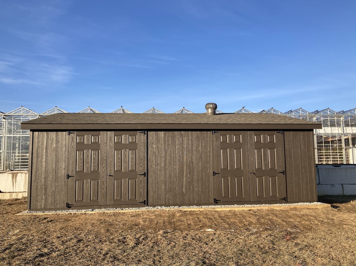 Shown in LP Painted Brown B & B siding, Brown trim, and Black roof