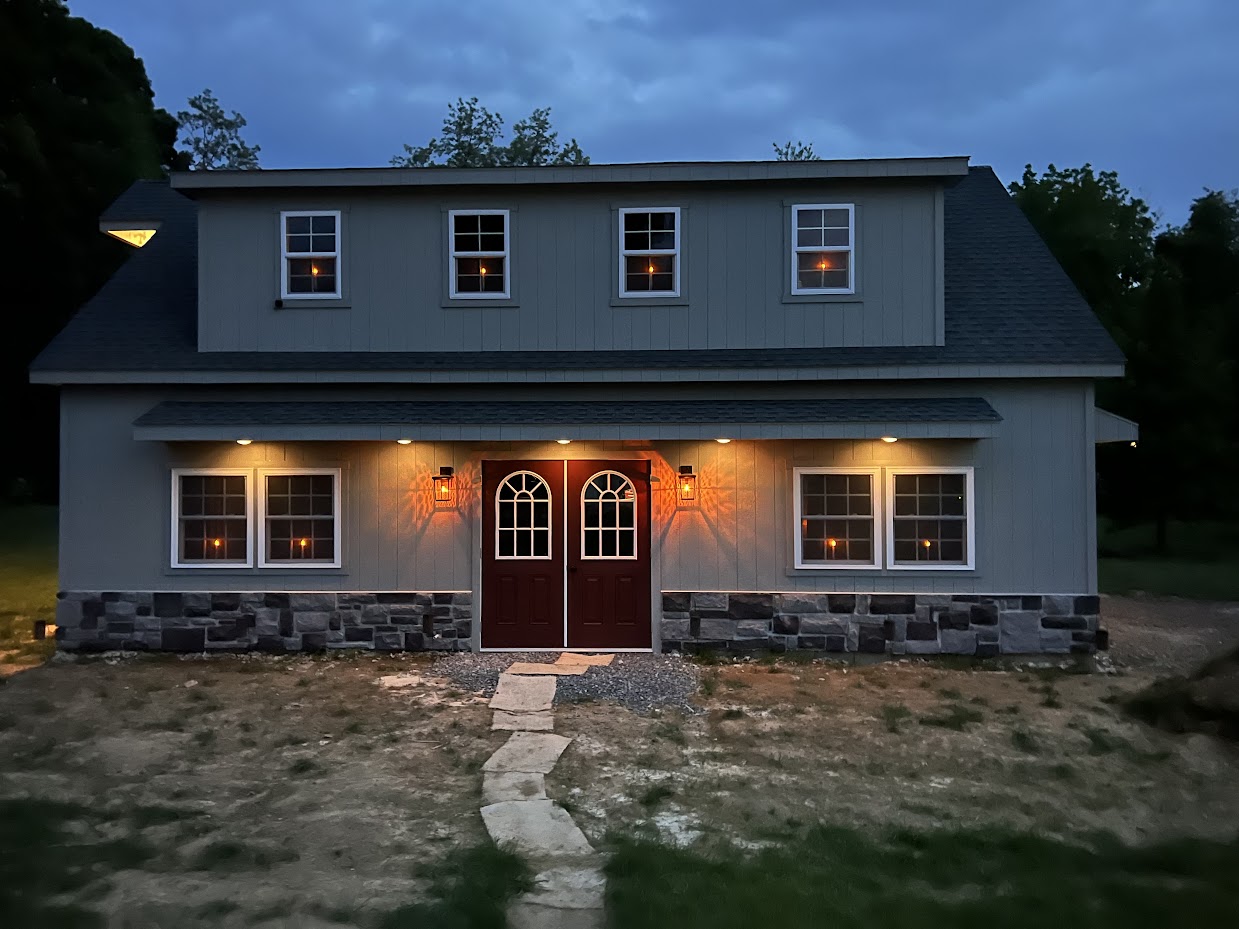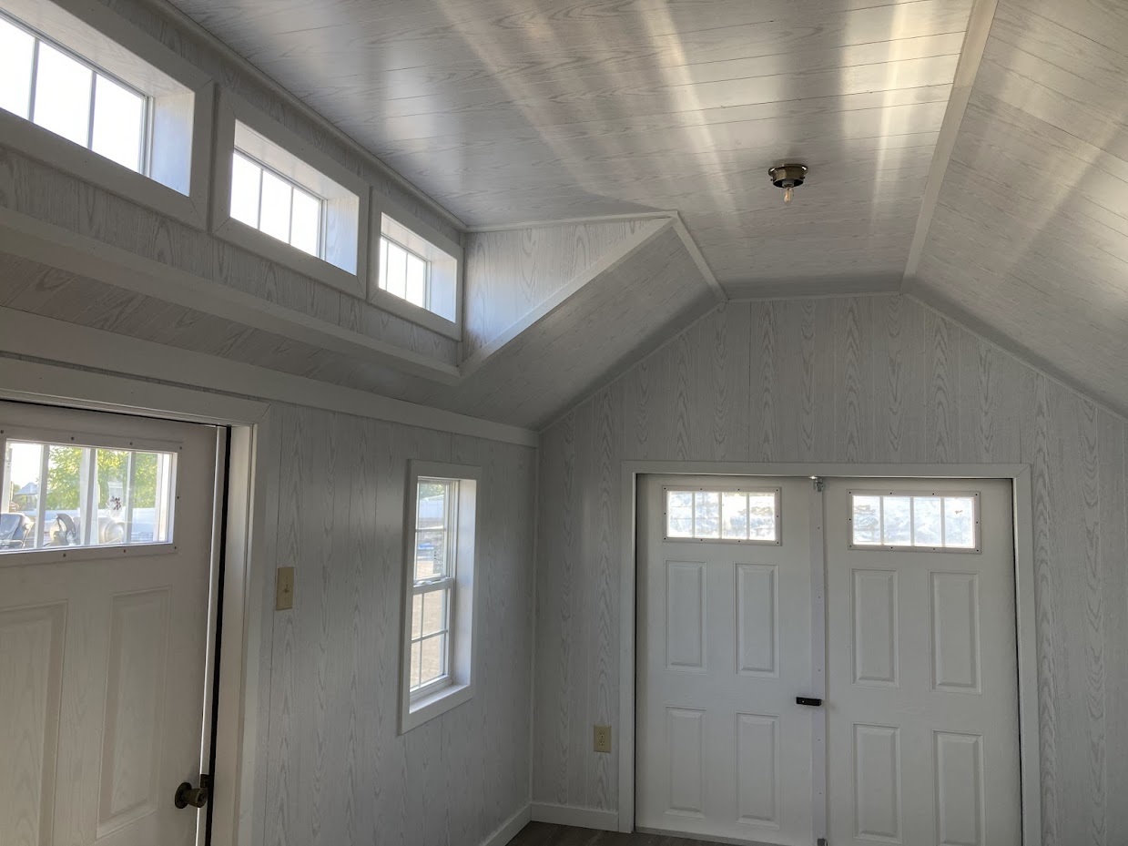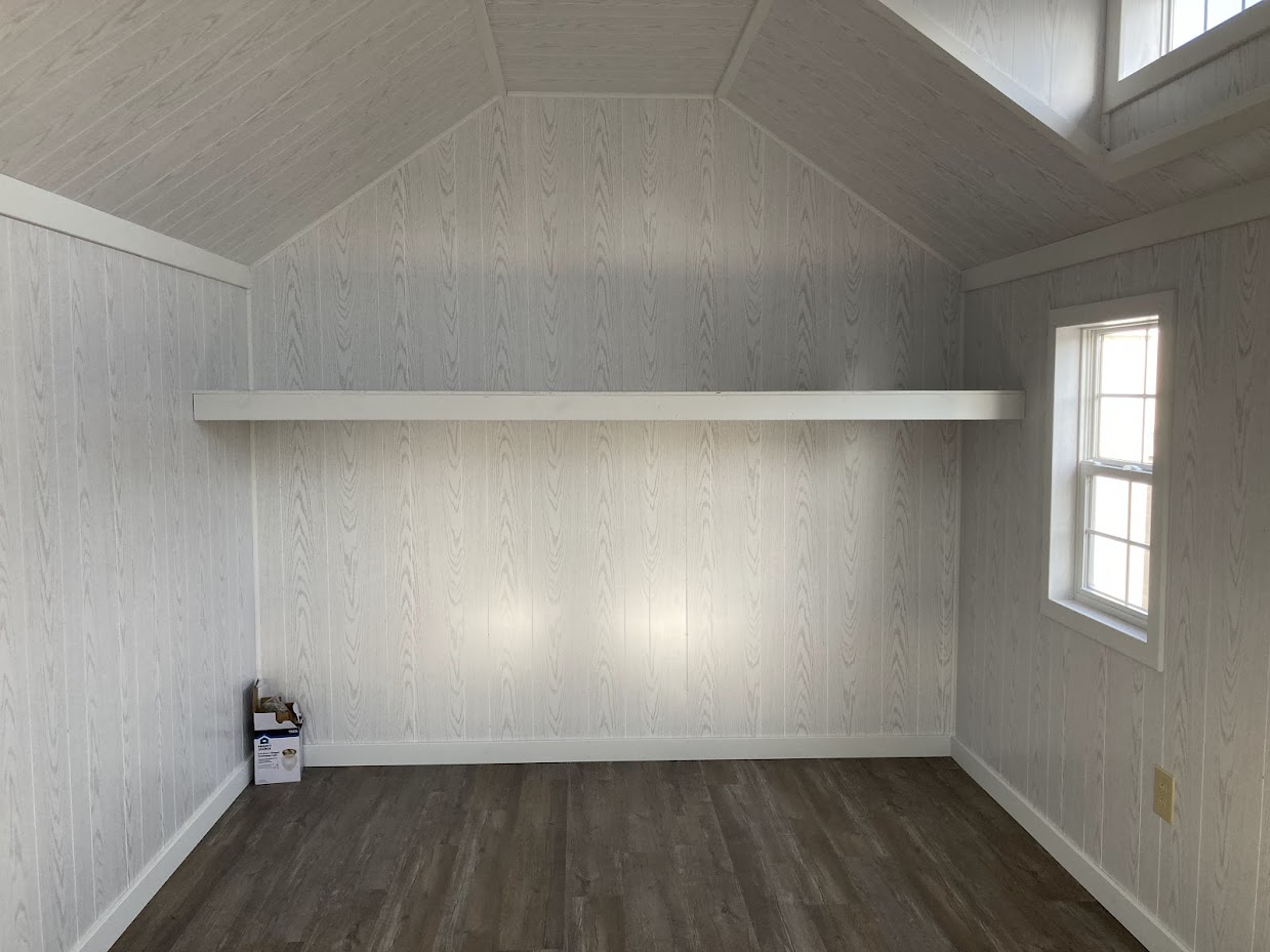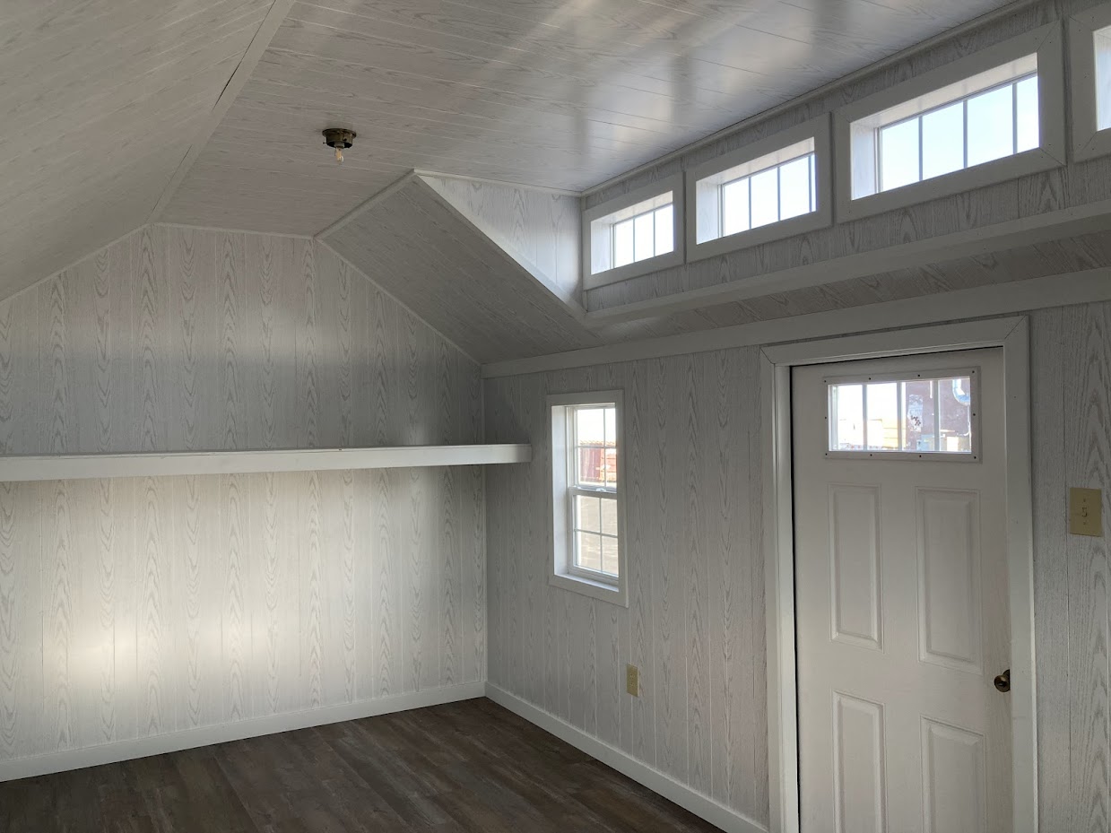 12×24 New England studio, office, fully finished, insulated, paneling, electrical, vinyl plank floor, vinyl stone front,