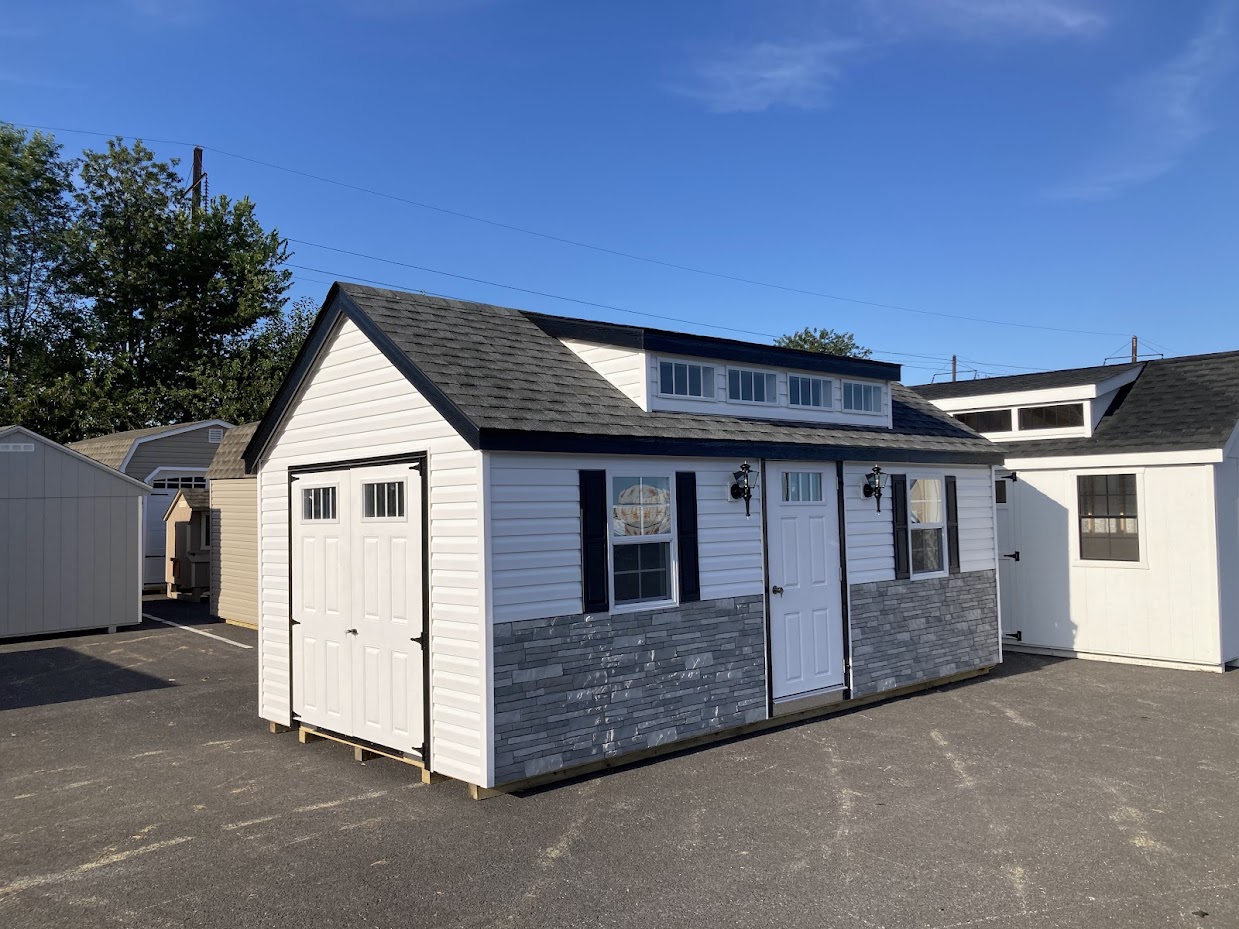 10×16 New England shed with a 7/12 roof pitch, 8′ transom dormer, LP Lap siding, and Black windows and roof.