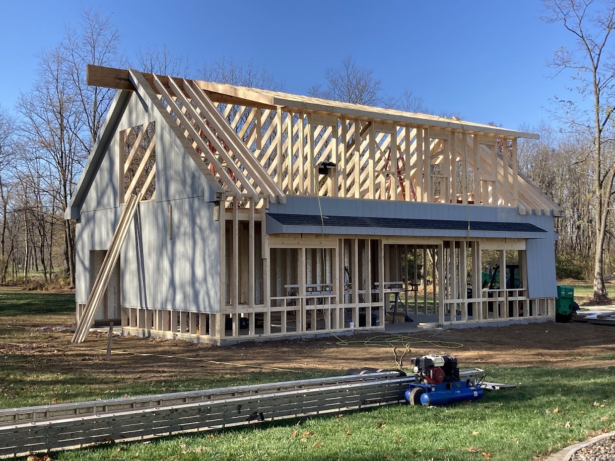 A 28×36 garage, with a 12/12 roof pitch, (1) 30′ shed dormer, 10×20 deck, and a 12×34 lean-to for equipment is a building that serves the purpose well.