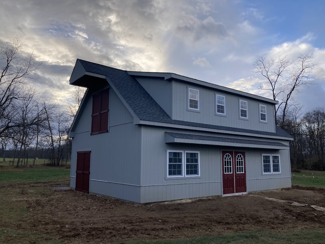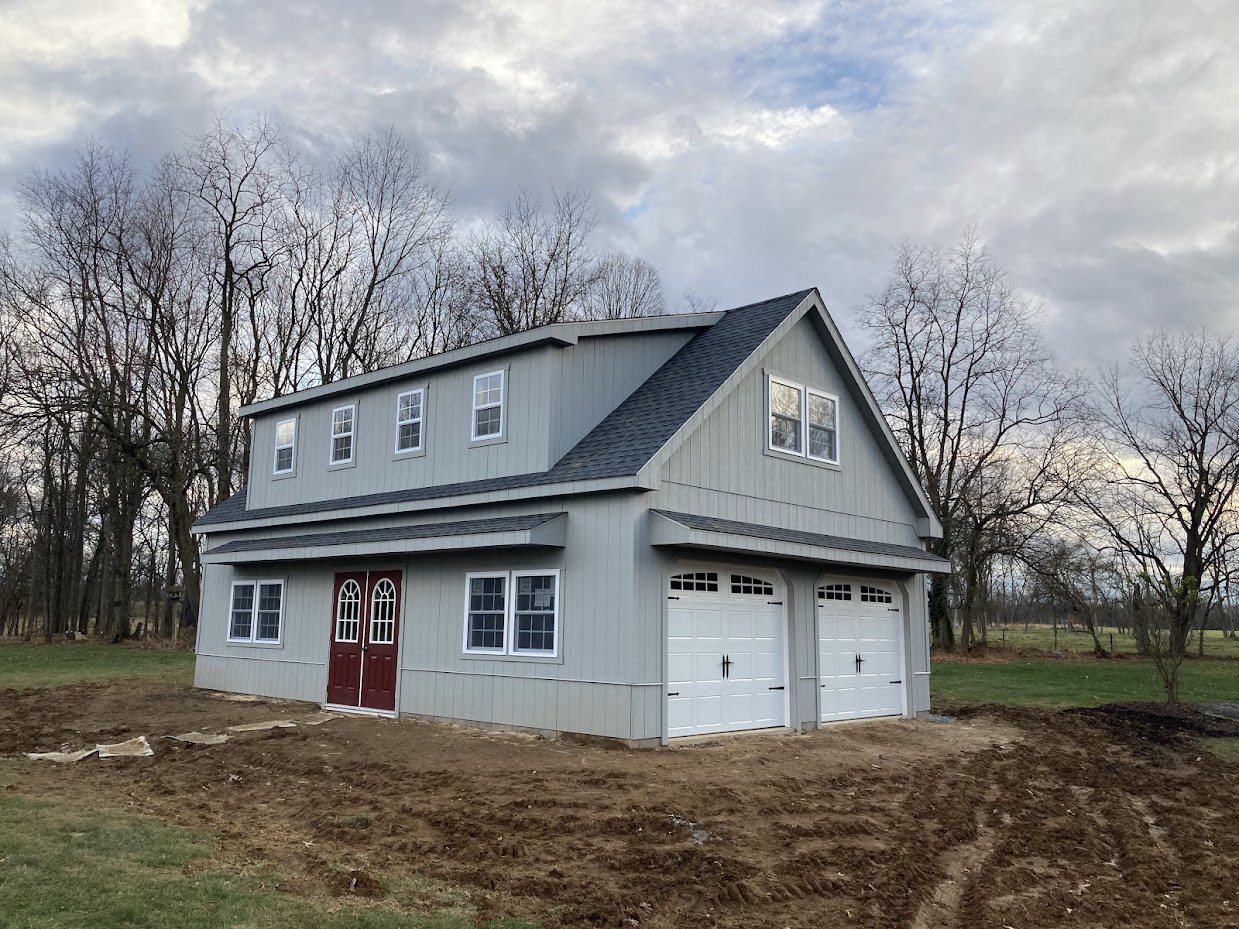 24×40 2 car garage with a Gambrel roof design, (2) transom dormers on each side, and a 12ft ceiling on the 1st floor.