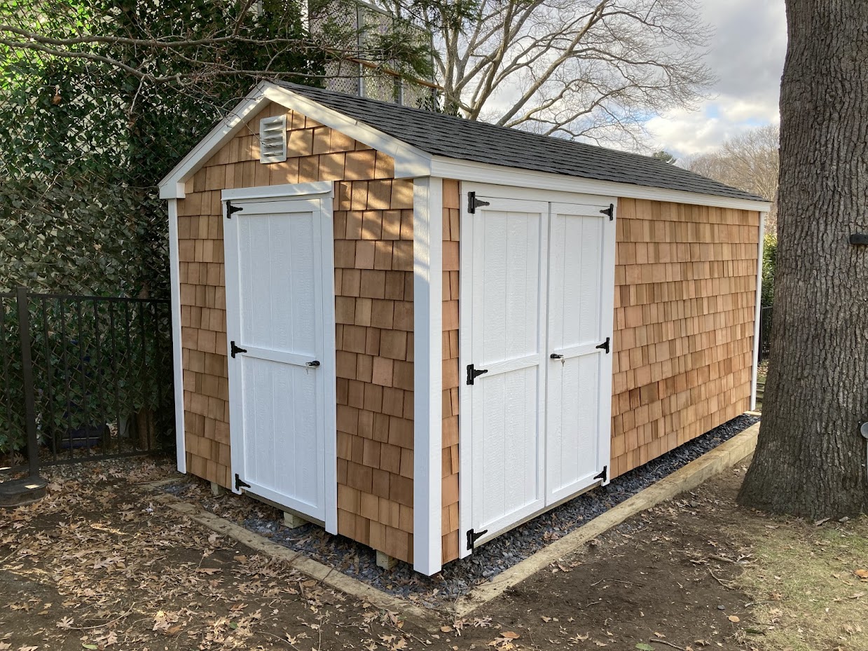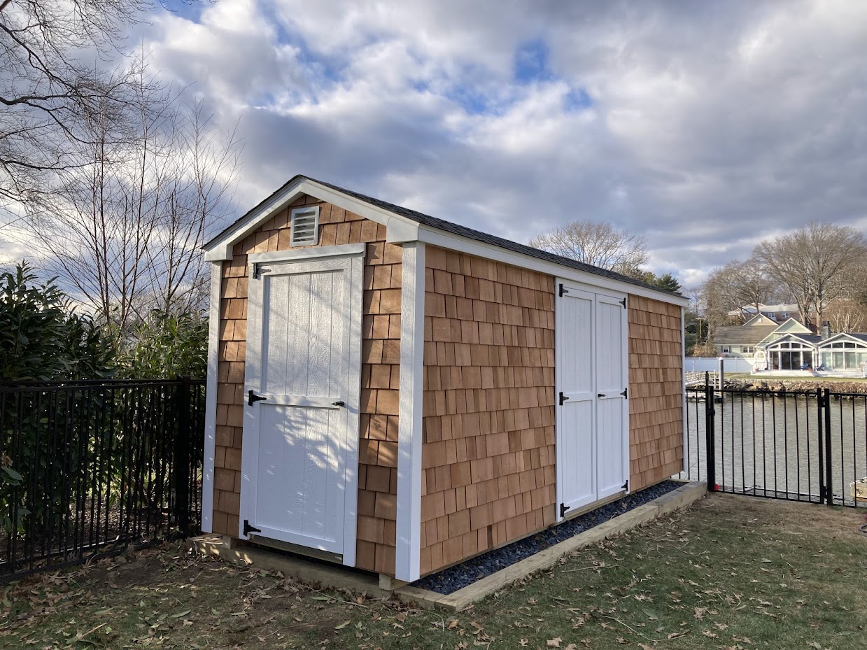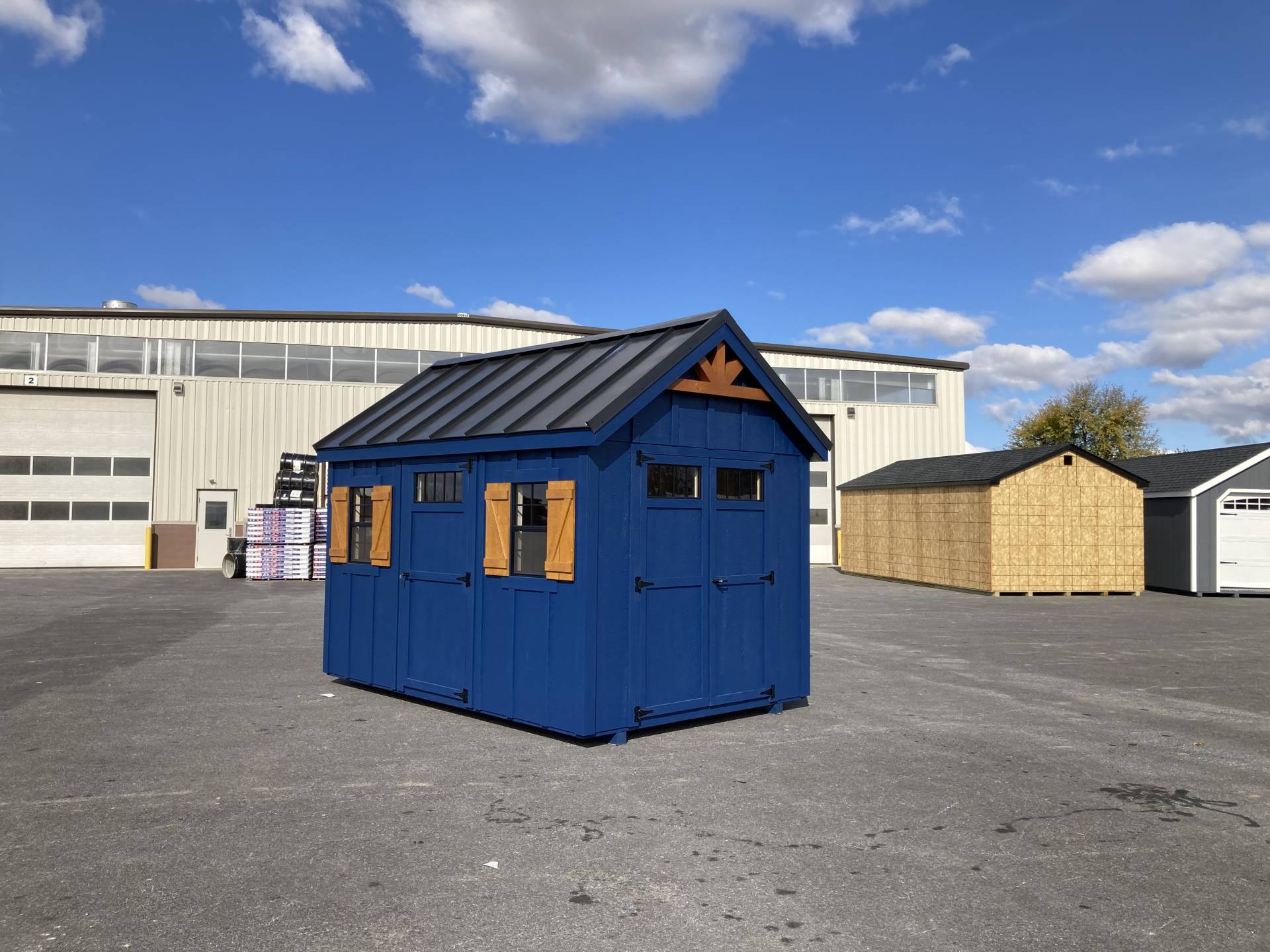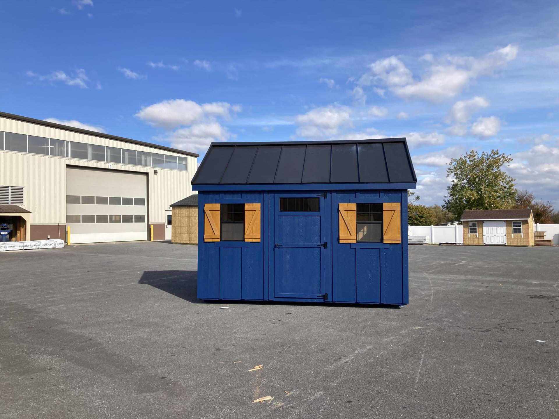 8×12 New England Style Modern Shed, featured with Standing seam roof, LP B&B siding, Decorative Stained Timber brace, Stained traditional shutters, 4×8 interior loft. Custom paint Salty Dog.
