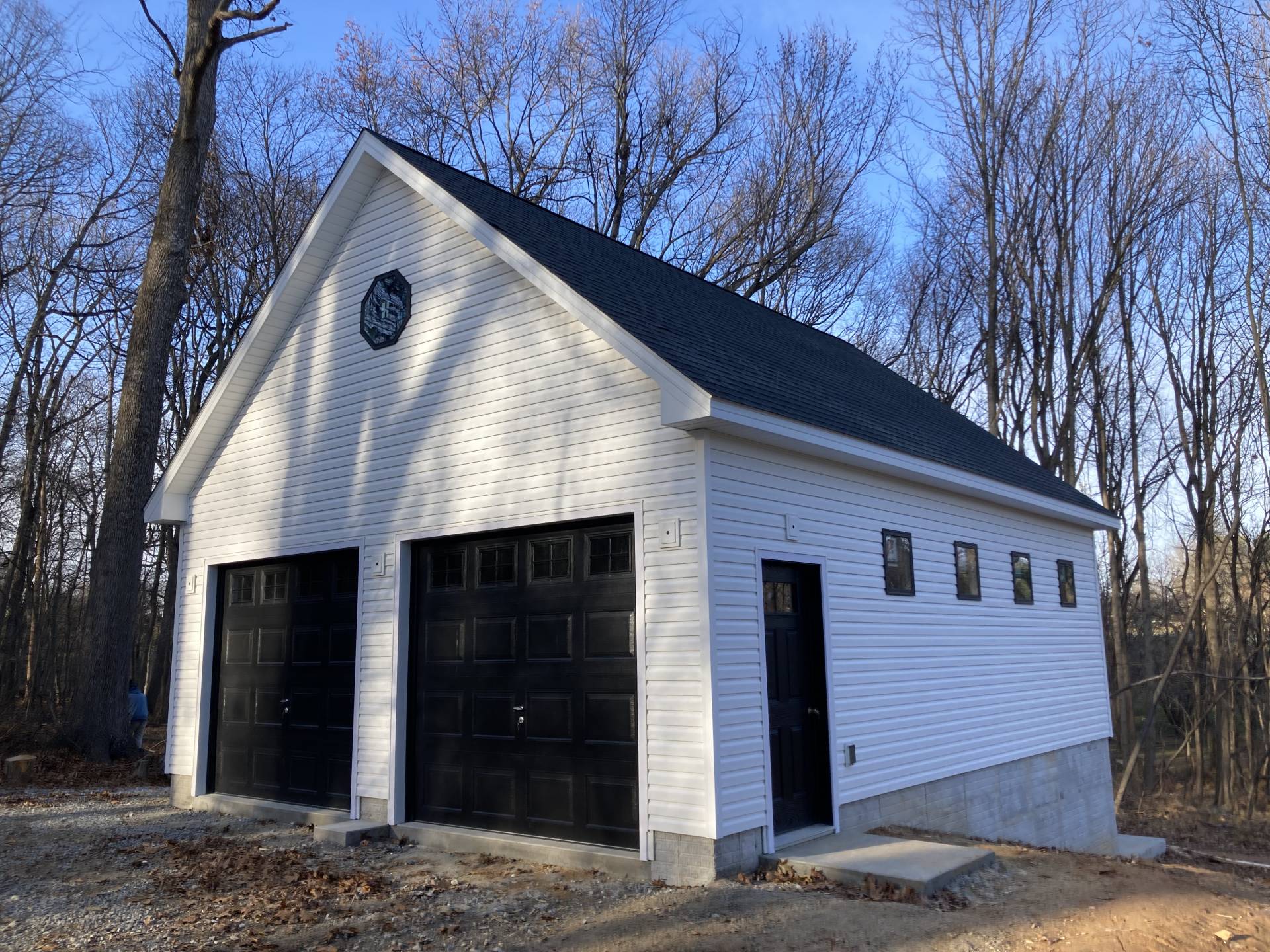 24×30 garage with TJI floor joist on the 2nd floor, 10/12 roof, 12” overhangs, 9×8 garage doors, Black custom windows, 9’ ceiling height.
